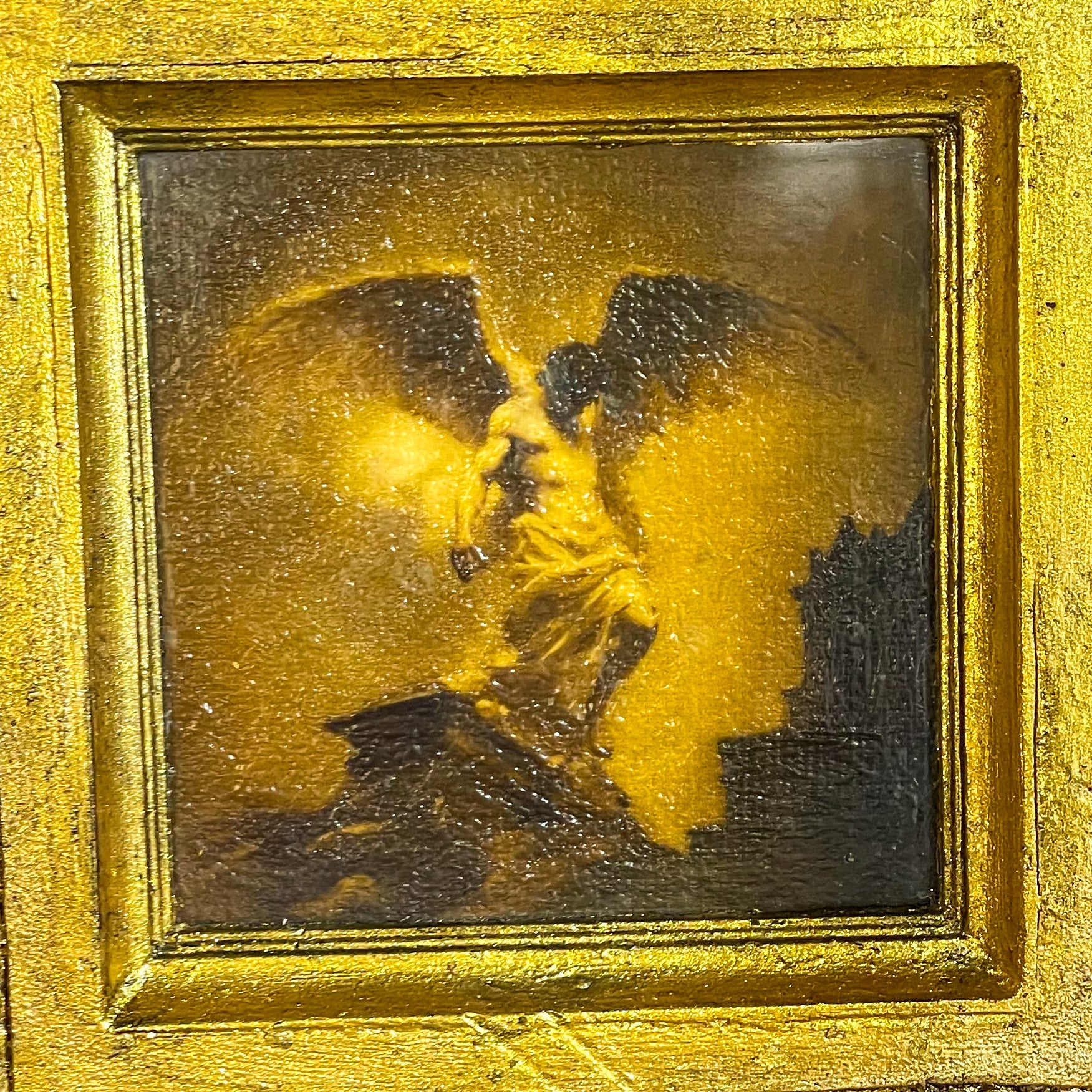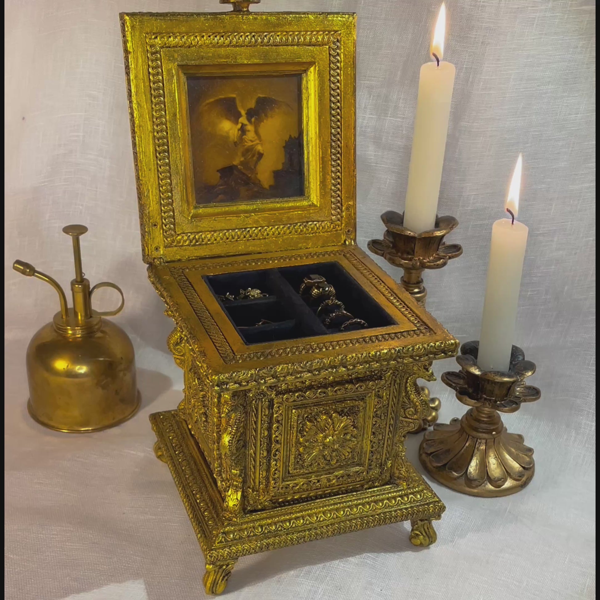À l’intérieur, la suédine noire accueillera vos bijoux avec délicatesse, tout en y dissimulant un tiroir secret, ingénieusement caché derrière un compartiment mobile. Mais c’est sous le couvercle que repose l’âme du coffret : une peinture d’ange déclinant, figé dans l’instant fragile où tout bascule. Un être céleste sur le point de s’effondrer, sur le point d’offrir son dernier souffle.