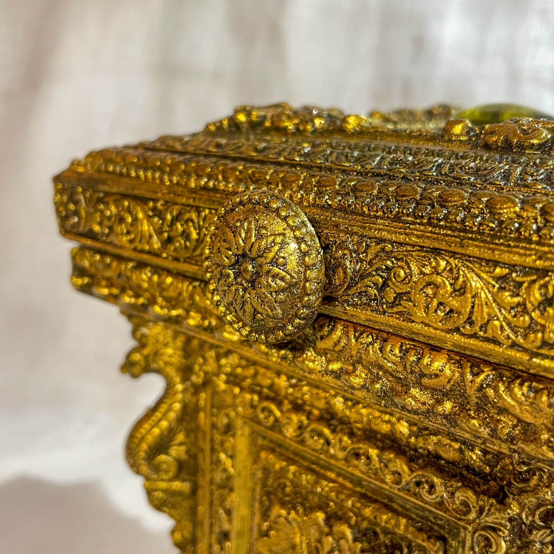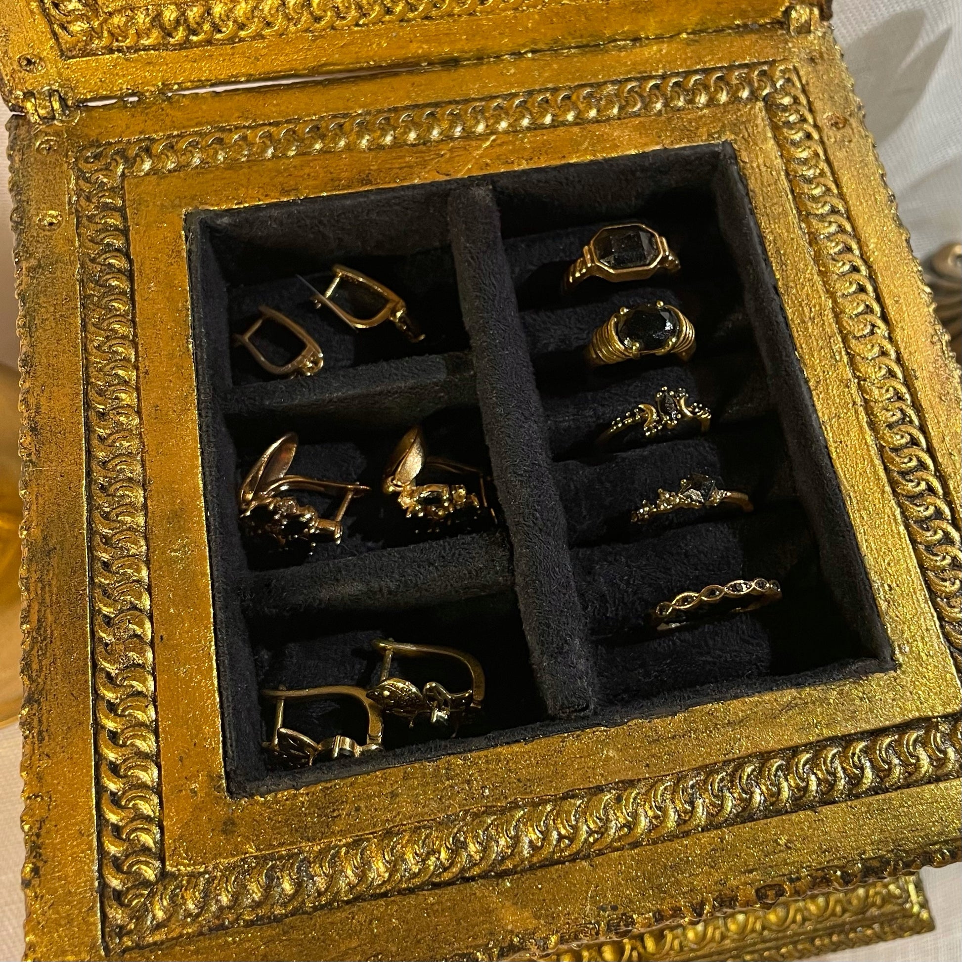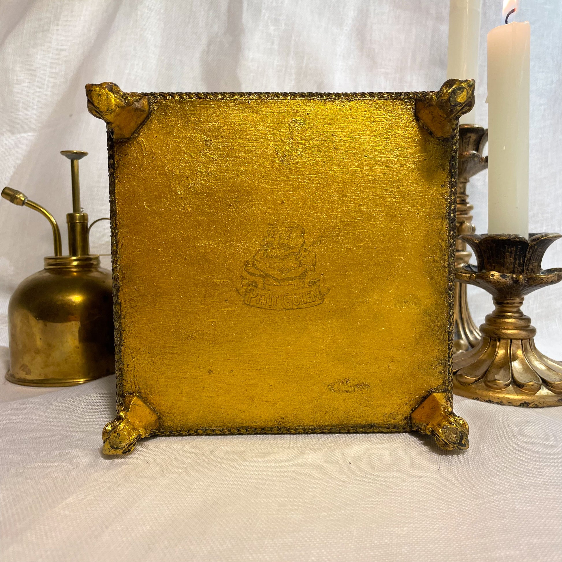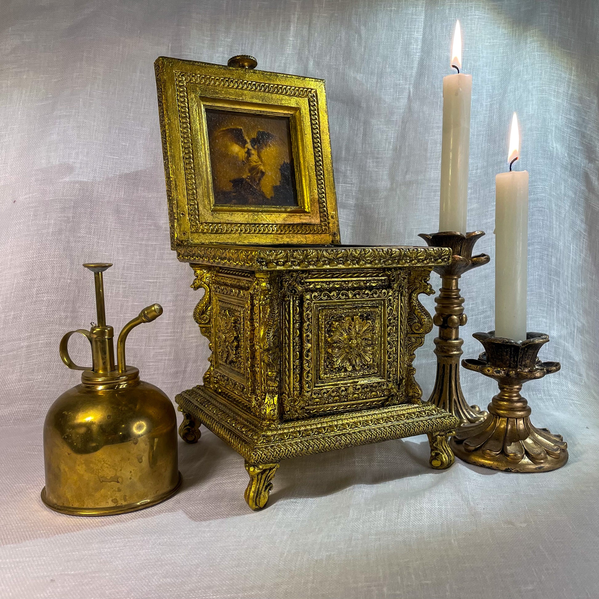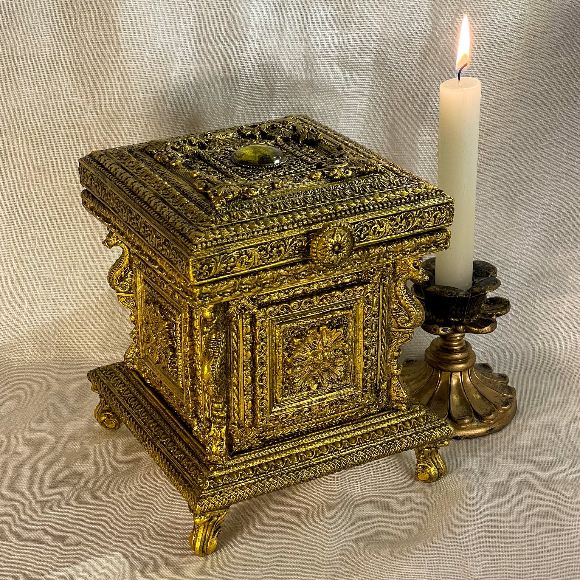 Né des cendres d’un monde ancien, ce coffret est un écrin de secrets et de poésie. Ses moulures baroques dorées à la feuille d’or, entourent un magnifique cabochon de résine ambrée.