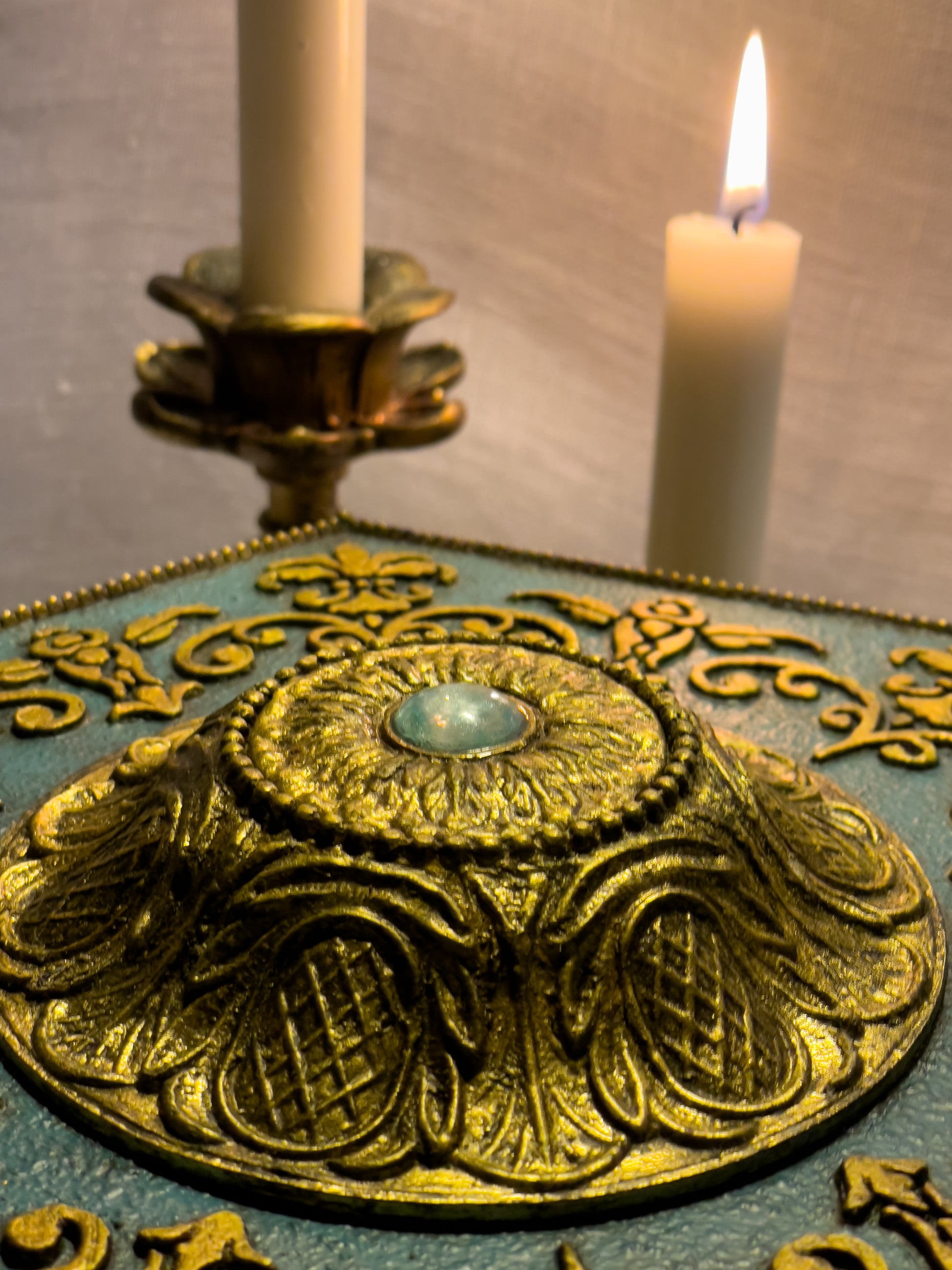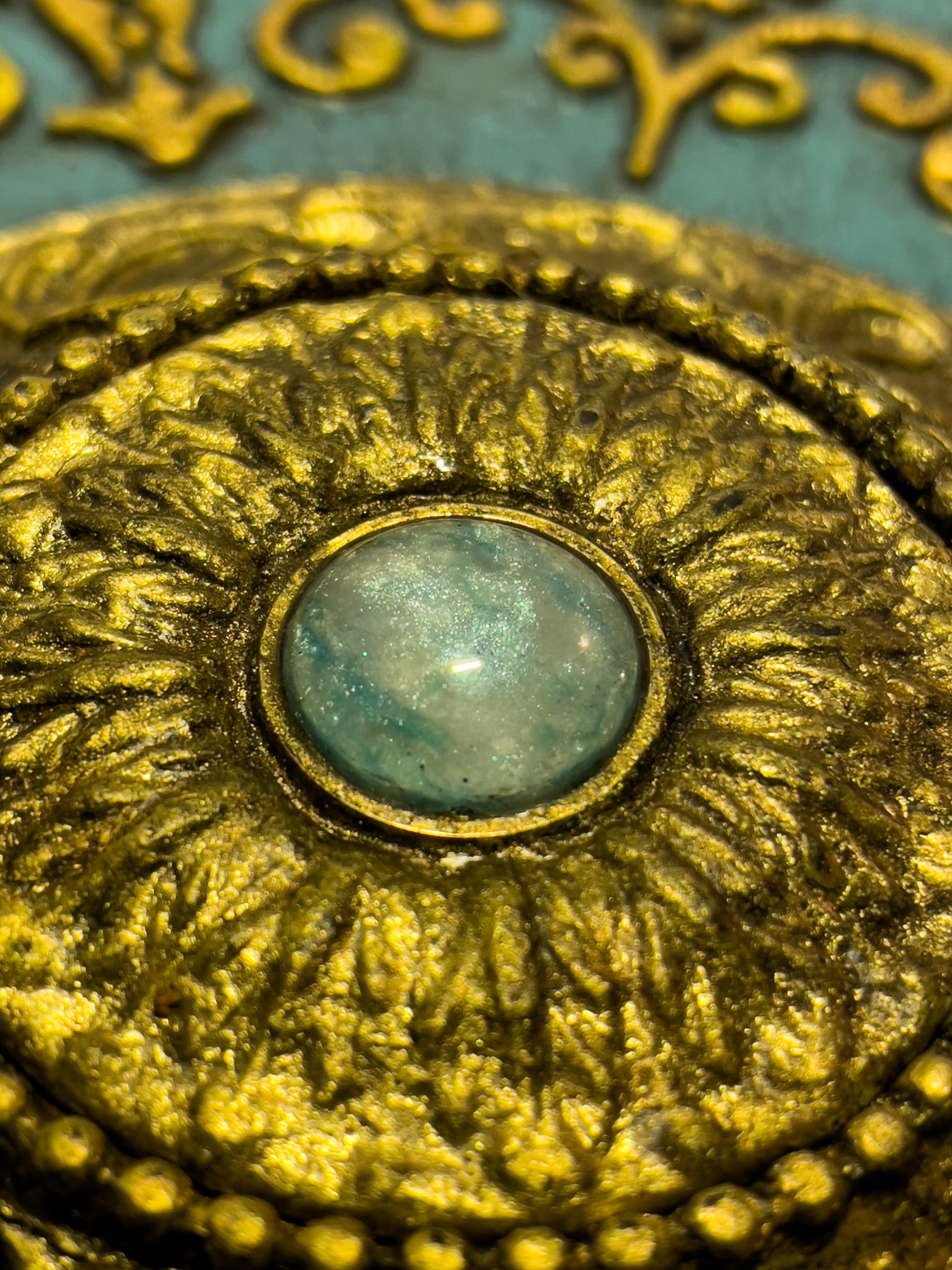 En son sommet trône un cabochon minéral aux reflets céladon, tel un œil ancien veillant sur les secrets qu’il renferme.