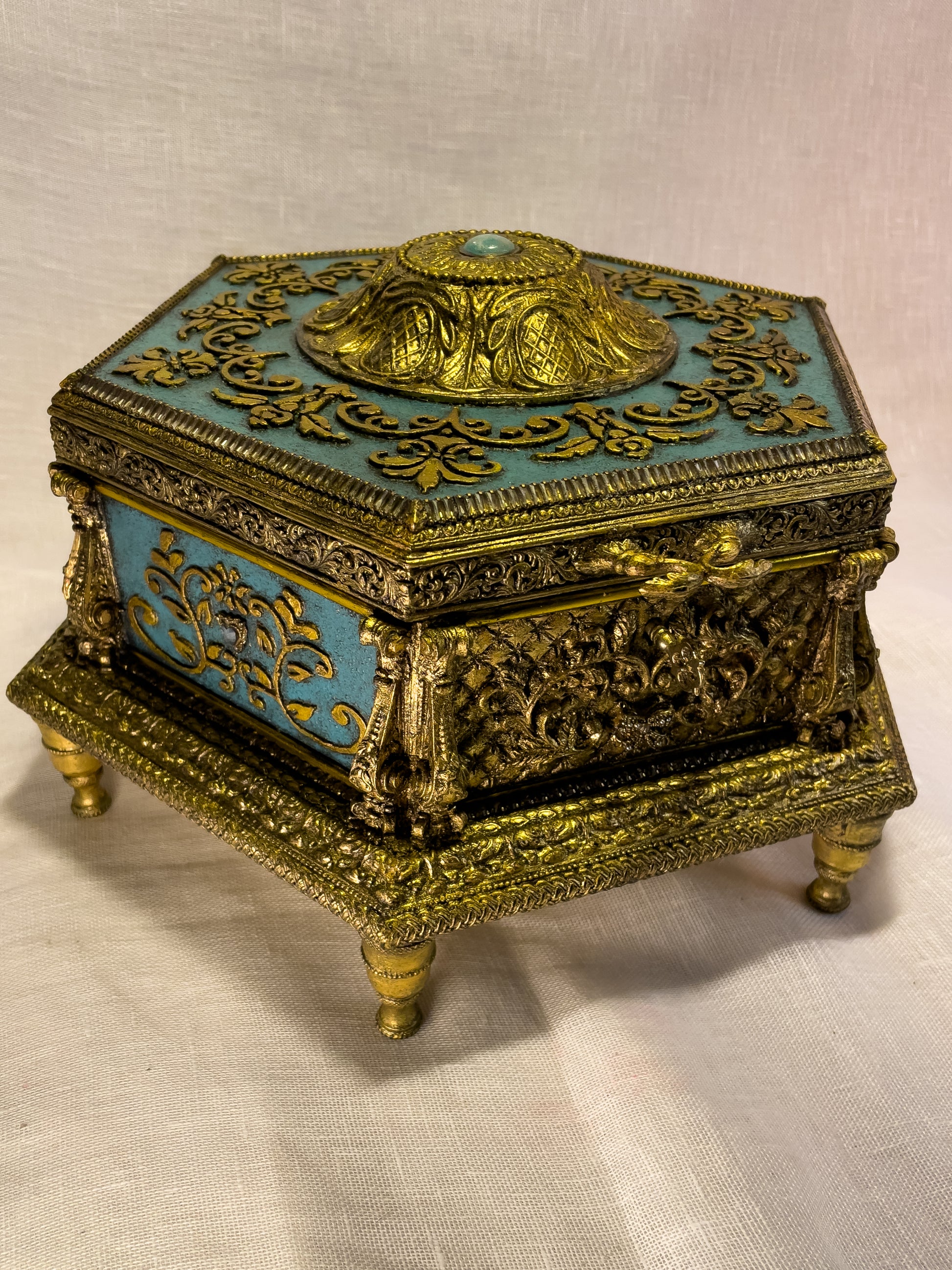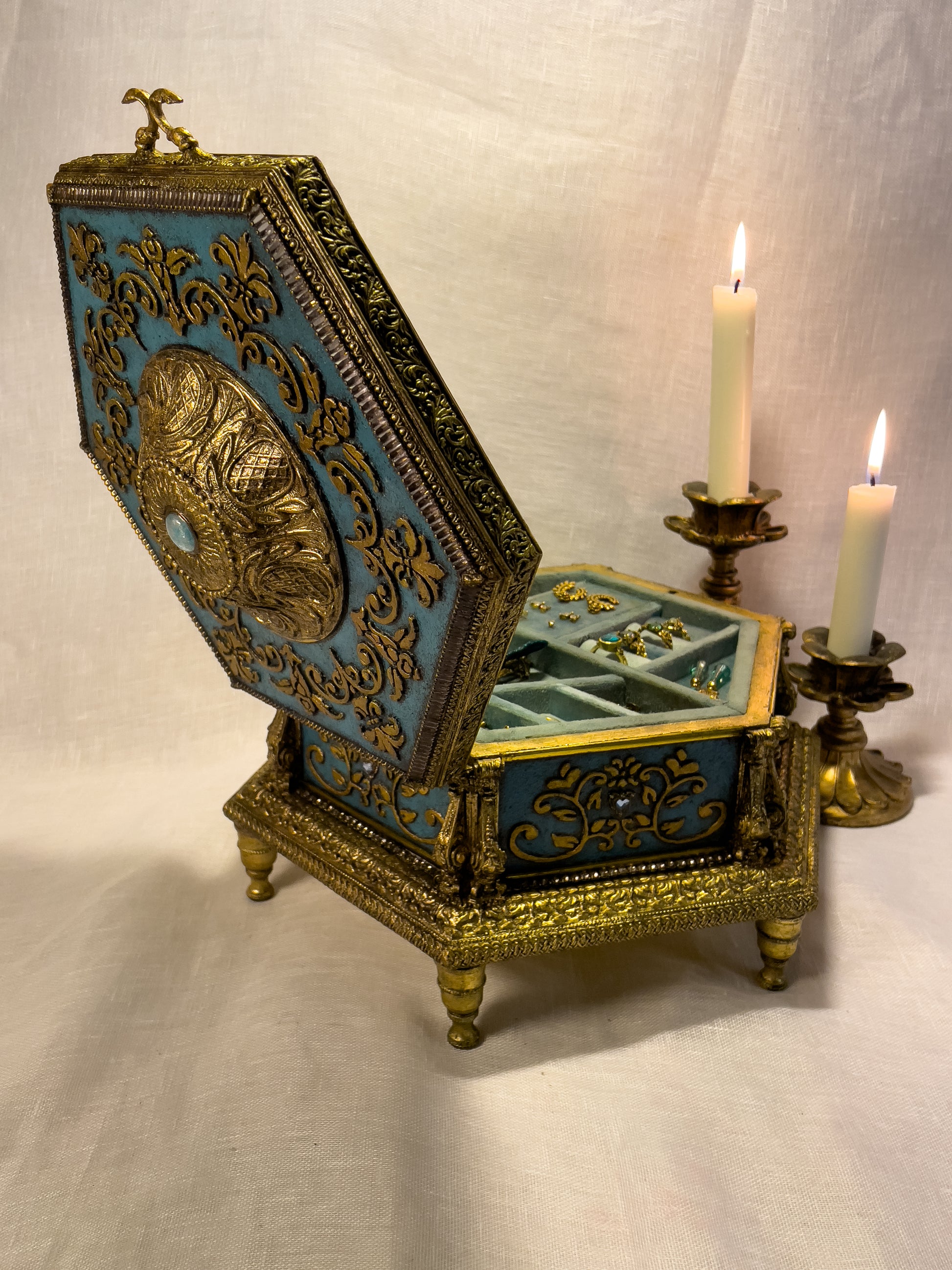À l’intérieur, un velours bleu enveloppe les bijoux dans une douceur presque sacrée. Les compartiments géométriques dessinent un écrin ordonné, mais trompeur : car ce coffret est un labyrinthe. Sept compartiments secrets y sont dissimulés, invisibles au premier regard, révélés seulement à celles et ceux qui prennent le temps d’explorer…